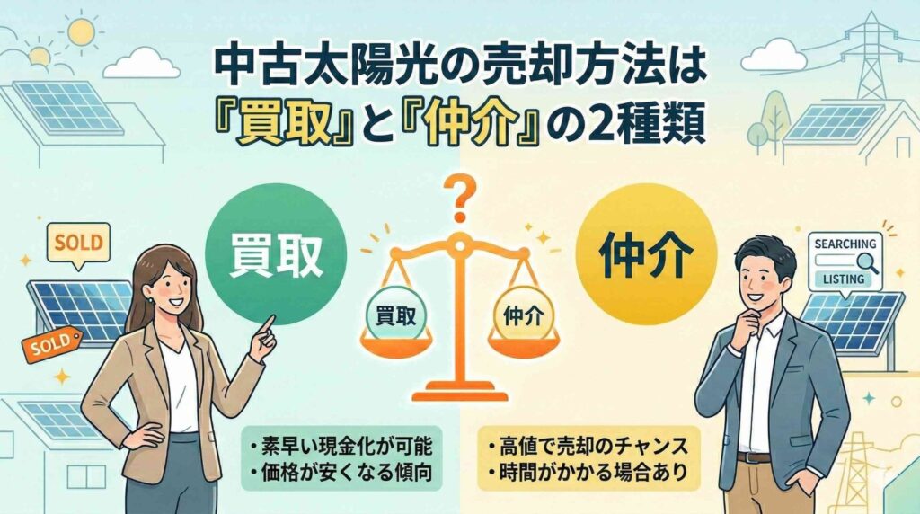 中古太陽光発電所を売却する方法は、大きく分けて「買取」と「仲介」の2パターンがあります。どちらも太陽光のセカンダリー市場で広く利用されている手法ですが、仕組みや特徴はかなり異なります。ざっくり言えば、買取は「業者が直接買い取ってくれる」方式、仲介は「業者が買い手を探してきてくれる」方式です。この違いを理解しないまま売却を進めてしまうと、本来もらえたはずの金額より数百万円も損をしてしまう…なんてことが起こり得ます。まずはそれぞれの基本的な仕組みを押さえておきましょう。
