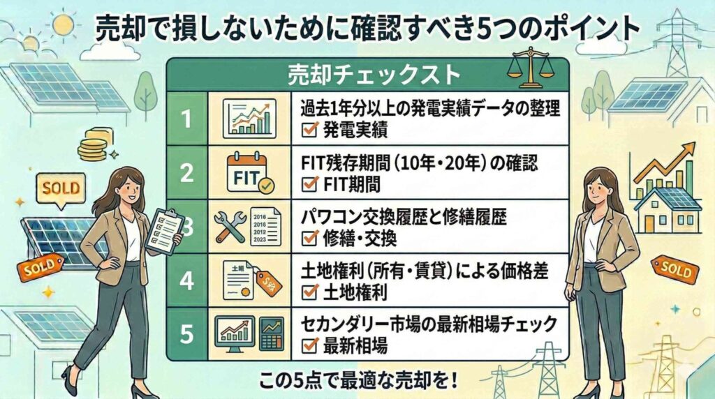 そして、どちらを選ぶにしても、事前準備が売却結果を大きく左右することを忘れないでください。発電実績データの整理、FIT残存期間の確認、パワコンの交換履歴、土地の権利関係、セカンダリー市場の相場——この5つを事前にしっかり押さえておくだけで、査定額が数十万円〜数百万円変わることは珍しくありません。