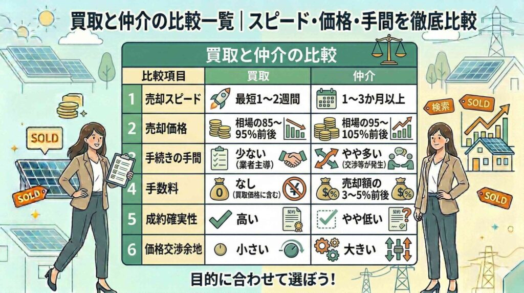 ここまで個別に見てきた買取と仲介のメリット・デメリットを、主要な観点で横並びに比較してみましょう。一覧で比べることで、それぞれの特徴がよりクリアに見えてくるはずです。
