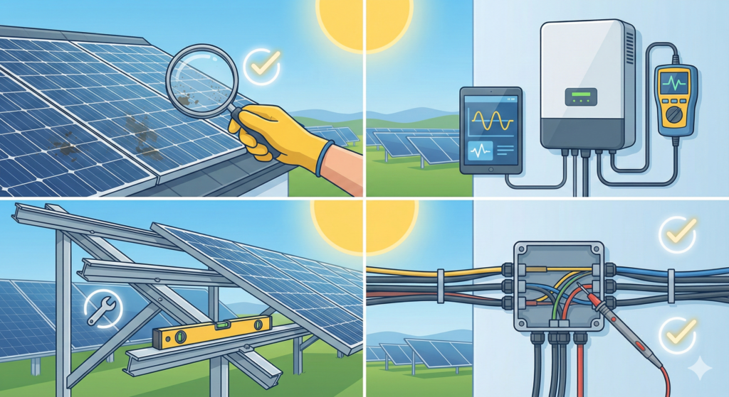 太陽光発電所の保守点検では、複数の設備を体系的にチェックする必要があります。それぞれの設備には固有の劣化パターンと故障リスクがあり、見逃すと発電ロスや停止につながります。ここでは、メガソーラー規模で特に重要な4つの対象設備と、それぞれで確認すべき具体的なポイントを実務的に解説します。投資家自身が点検報告書を読み解く際にも、これらの項目が網羅されているかを確認する基準として活用できます。
