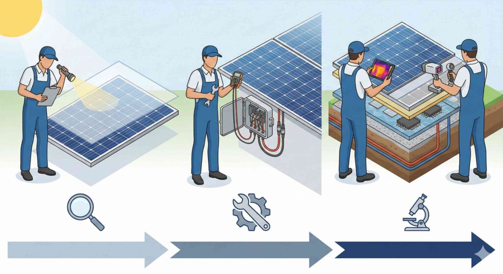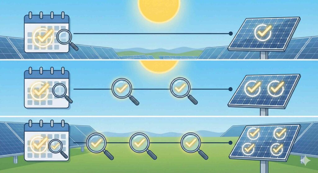 太陽光発電所の点検には、目的や状況に応じて異なる深さのレベルがあります。すべての点検を常に最高レベルで実施するのはコスト的に非効率であり、逆に常に最低レベルでは重要な異常を見逃すリスクがあります。3段階の点検レベルを理解し、適切に使い分けることが、コストとリスクのバランスを最適化する鍵です。